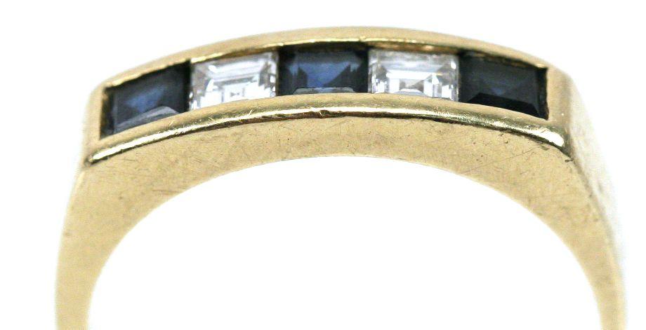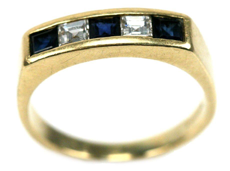 Men's 14K gold band with (2) 0.2ct square emerald cut diamonds and (3) 0.2ct square emerald cut sapphires in a channel setting. . Size: 11 . Weight: 5.8 g . Condition: Very good