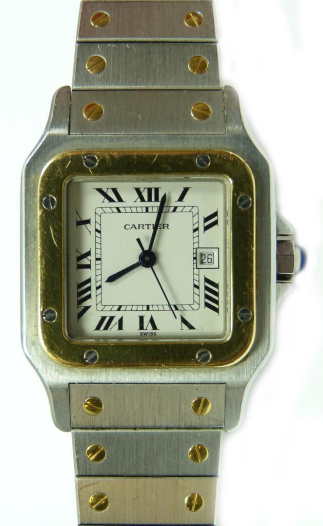 A men's 18k yellow gold and stainless steel Santos de Cartier wristwatch. White enamel face with black Roman numerals and notches. Cobalt blue hour, minute and second hands. Date to right hand side. Has screw design throughout. Verso marked 'Santos de Cartier AUTOMATIQUE SWISS MADE OR ET ACIER 1172961 118351'. Band approx. 7" length. Face measures 1 1/8" length x 1 3/16" width (2.8cm x 3cm). Total weight of 87.9 grams. Includes original box.