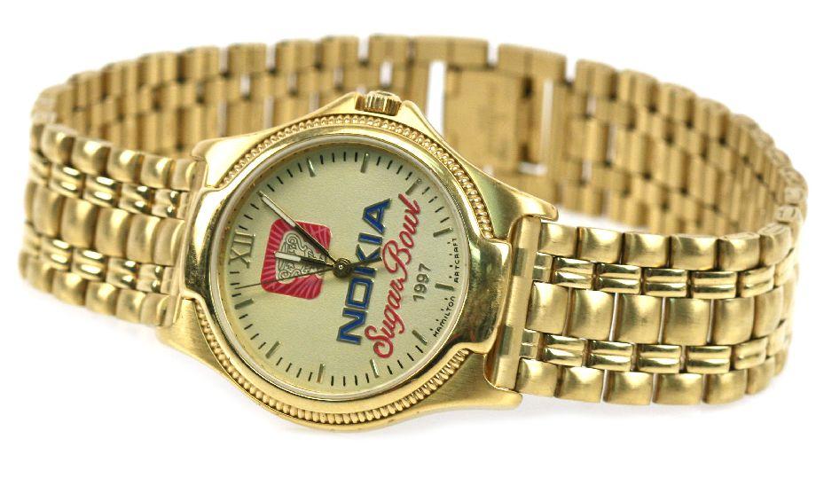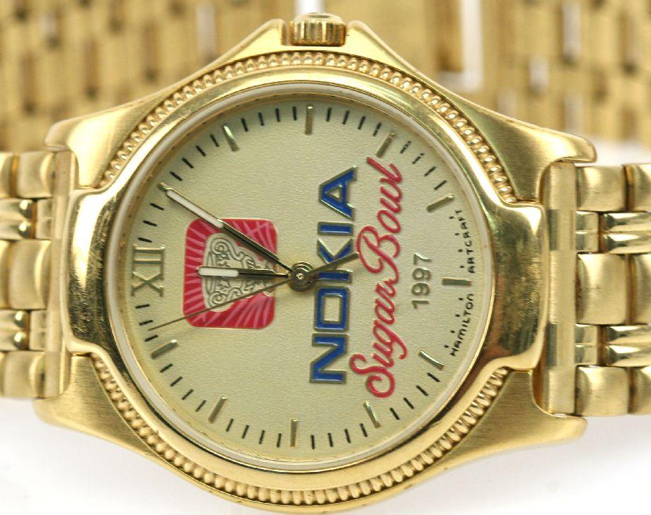 Commemorative 1997 Nokia Sugar bowl National Championship watch by Hamilton. The game pitted long time rivals Florida Gators v. Florida Seminoles. UF defeated FSU 52-20. Movement: automatic Case: 34mm; stainless steel Band: 8 inches; stainless steel Face, Dial, Hands: Gold tone face with gold Roman numerals and hands Condition: Very good, may need servicing.