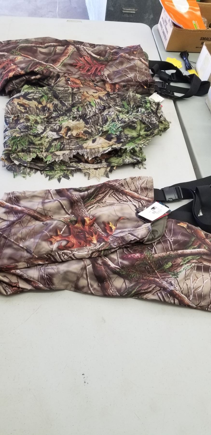 MENS HUNTWORTH MICROFIBRE HUNTING PANTS MEDIUM QTY X 2, AND MENS CAMO PANTS SMALL, QTY X 1 RETAIL $190