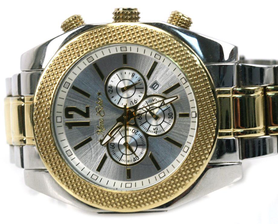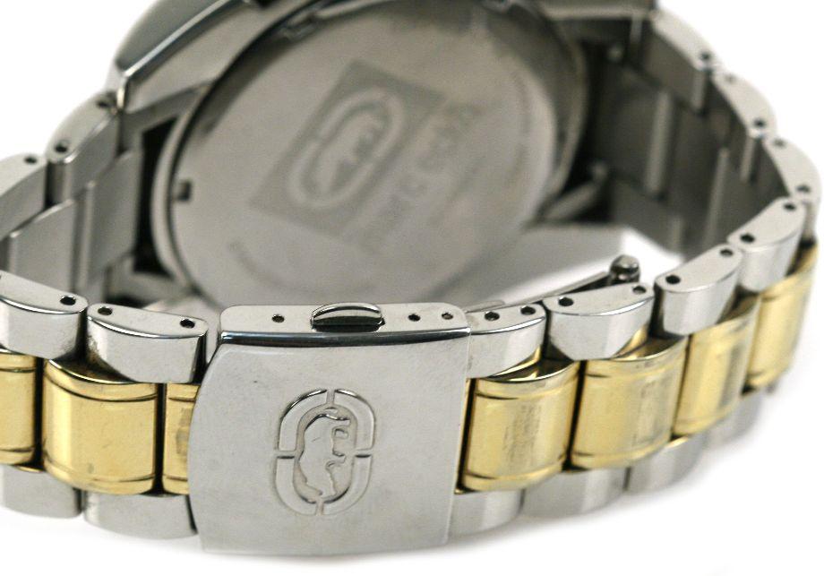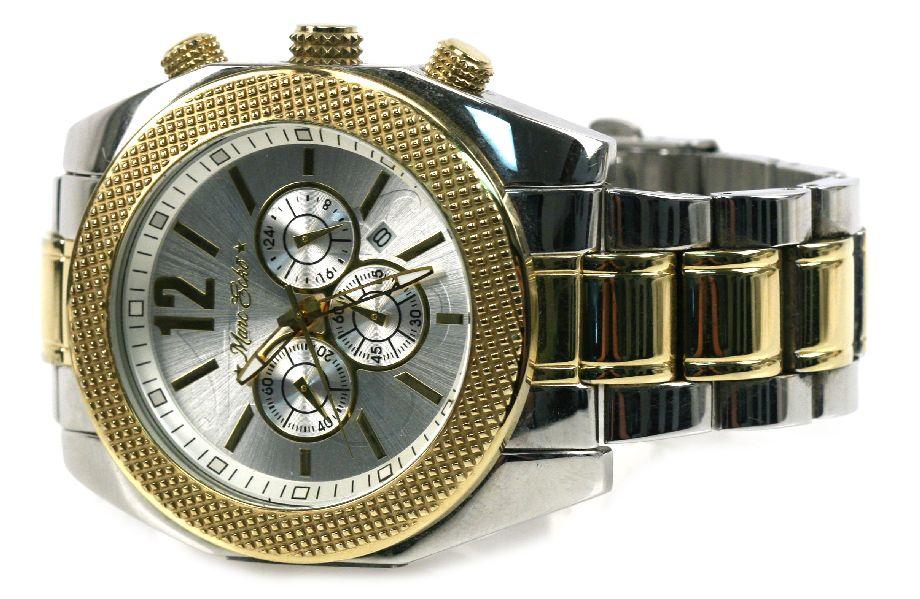 Model E23502G1. Serial # 008291972. Chronograph and date functions. Movement: automatic Case: 46mm; stainless steel Band: 8 inch stainless steel Face, Dial, Hands: Silver face with gold tone baton numerals and hands Condition: Very good with minor wear to band