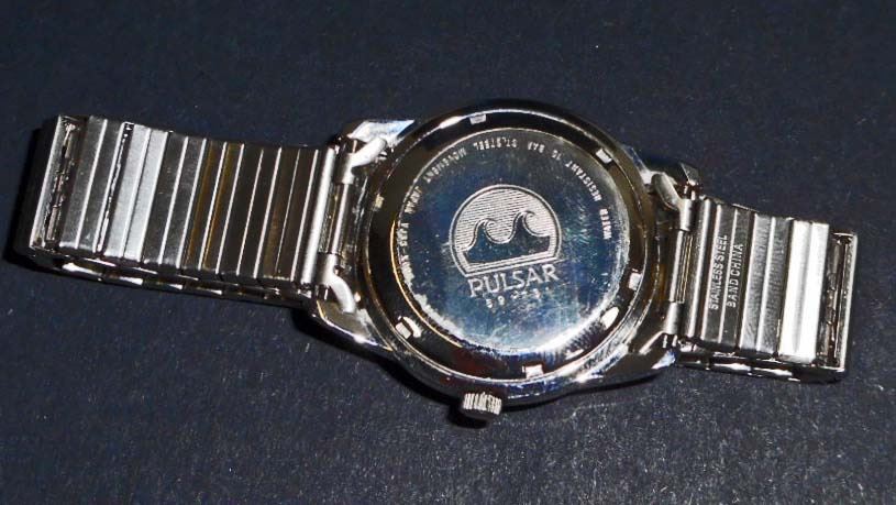 The face reads 'Pulsar 100m Water Resistant YJ33-X007R'. The back of the watch case reads 'Pulsar 591731 Water Resistant 10 Bar St Steel Movement Japan VJ33-X006'. Needs a battery. Looks to be in excellent condition.