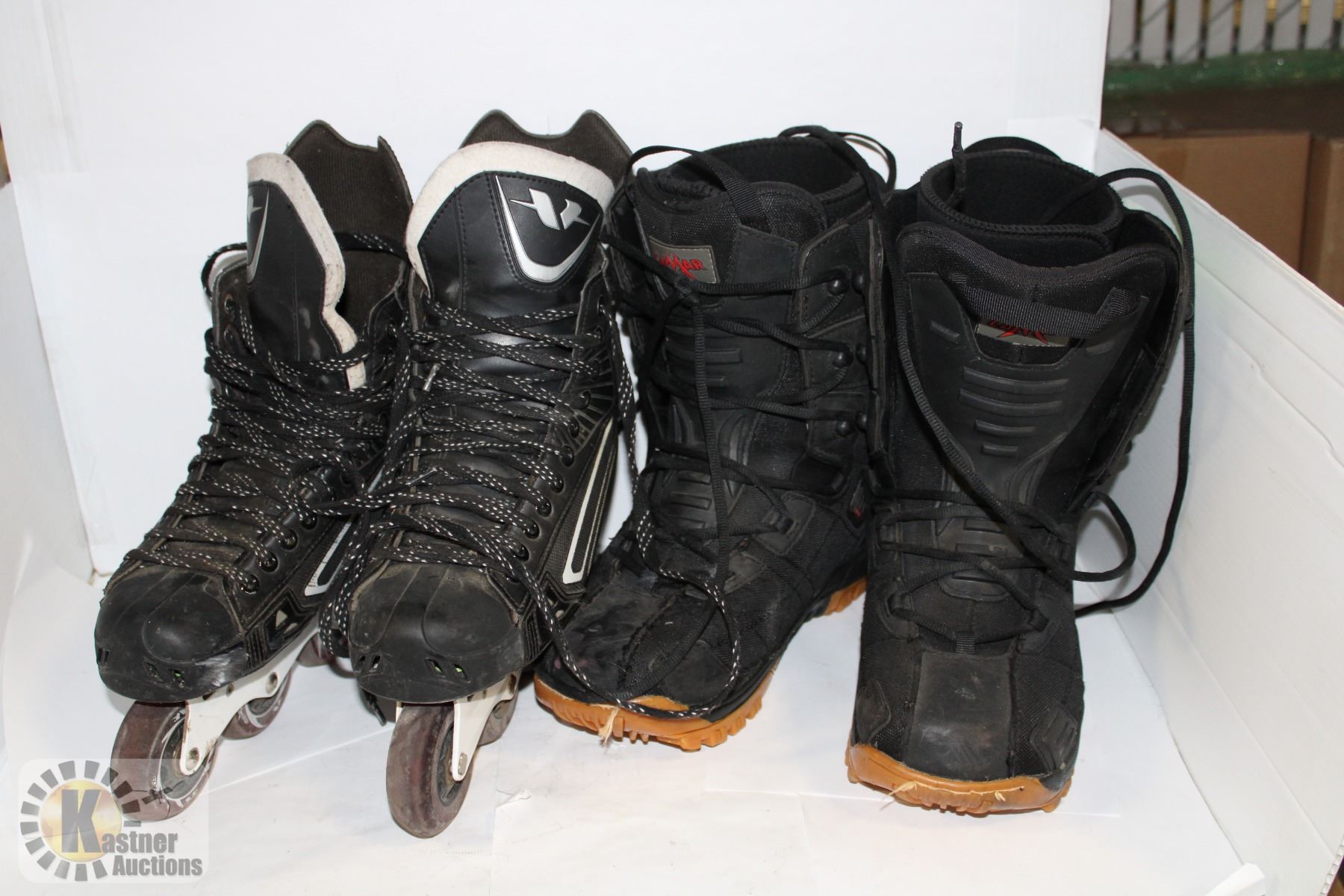 MENS SIZE 8 SNOWBOARD BOOTS + ROLLER BLADES