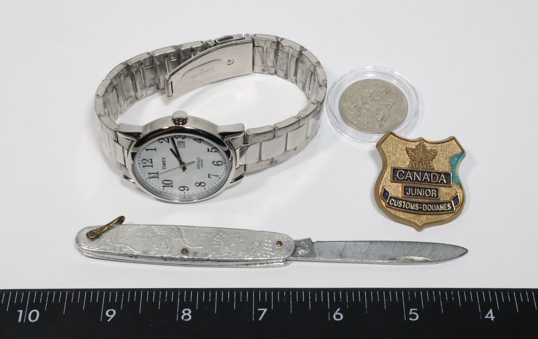 KNIFE, 1970 CANADIAN 50 CENT COIN, AND CANADA JUNIOR CUSTOMS PIN