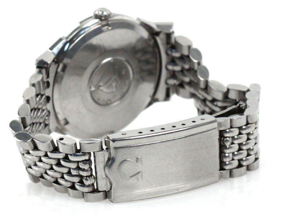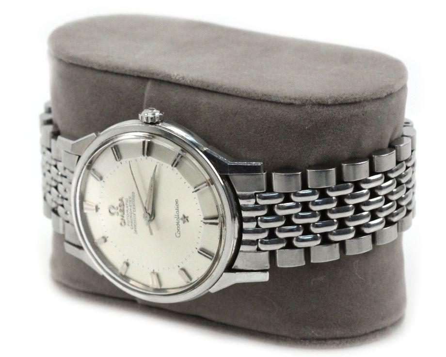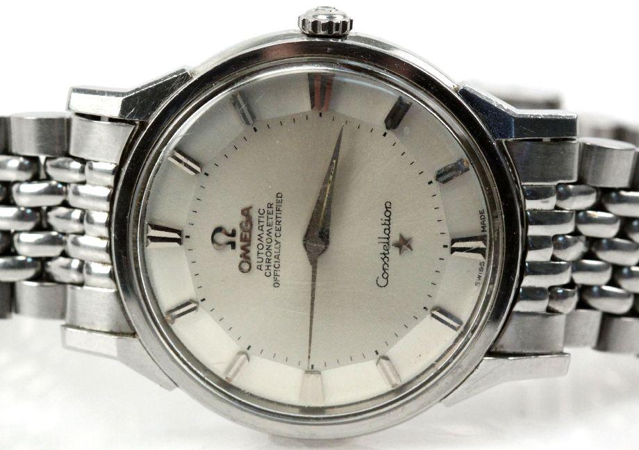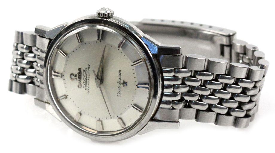 A gents stainless steel automatic wristwatch Constellation.1960s 24 jewel 551 movement. Silvered 'Pie-Pan' design dial with applied baton markers and center seconds. Circular 34mm case with faceted angled lugs, screw down back with Constellation motif. Case, dial and movement signed.