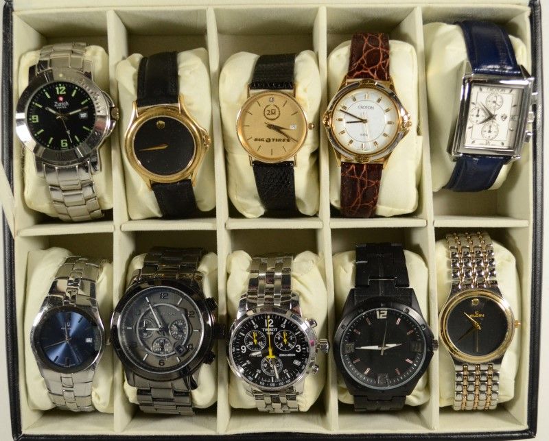 All these watches appear to have been previously worn, but are all in excellent working condition. Set comes on a black leather display case. Includes the following watches: ZURICH SWISS ZSWM3378, MOVADO SWISS 9171464, BULOVA QUARTZ 14K BACK W/DIAMOND, CR
