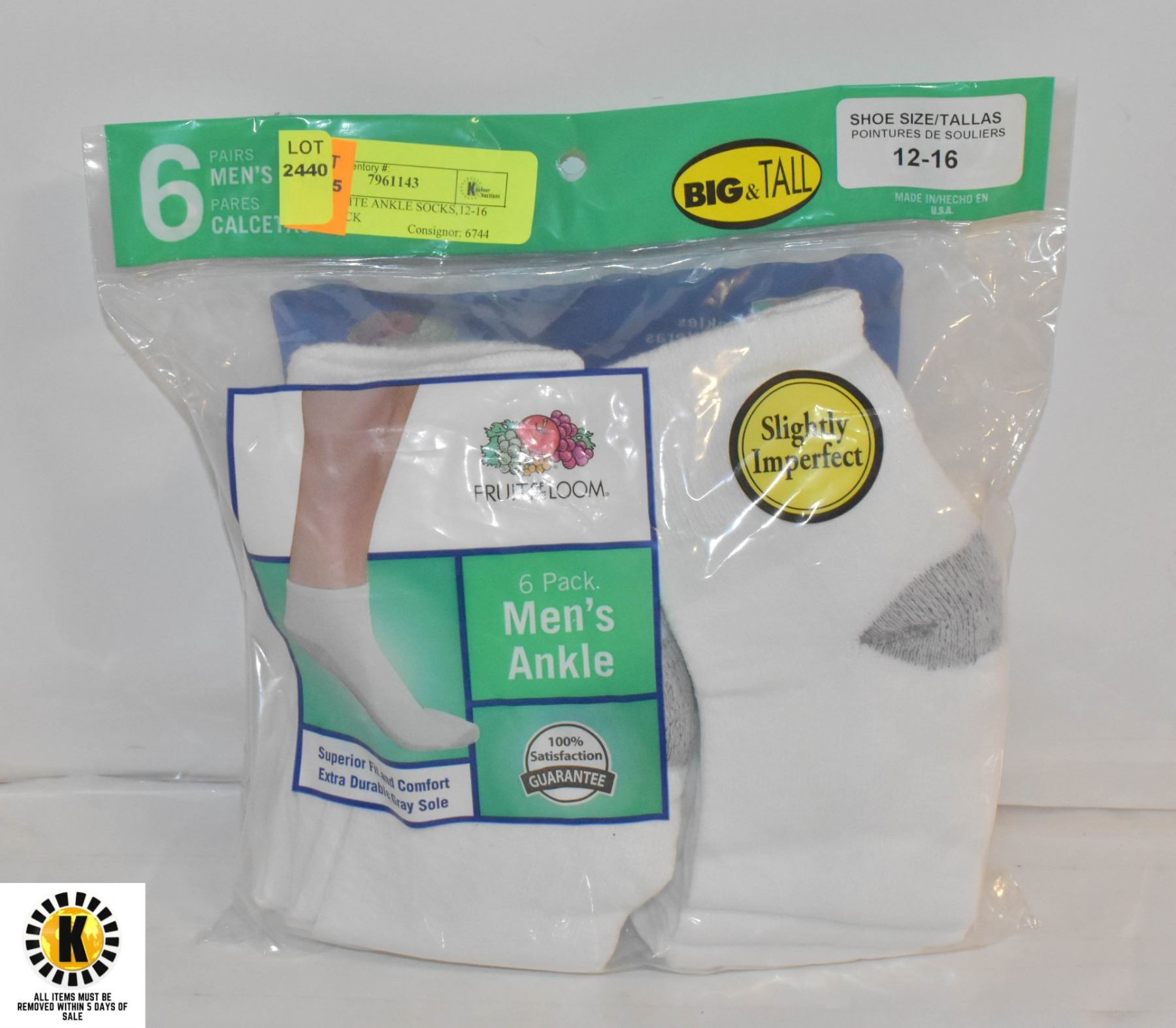 MENS WHITE ANKLE SOCKS,12-16 SIZE 6-PACK