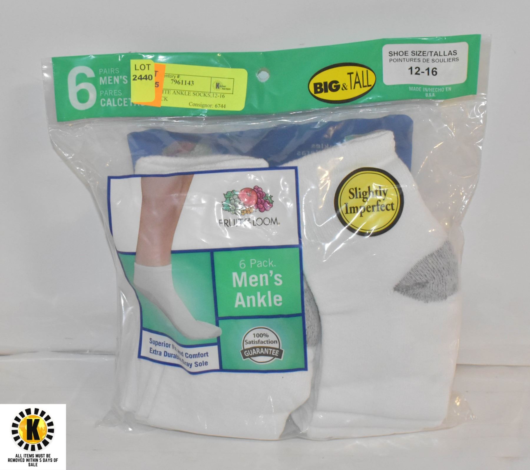 MENS WHITE ANKLE SOCKS,12-16 SIZE 6-PACK