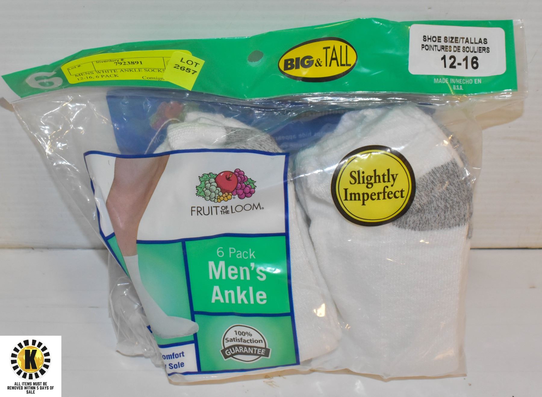 MENS WHITE ANKLE SOCKS, SIZE 12-16, 6 PACK
