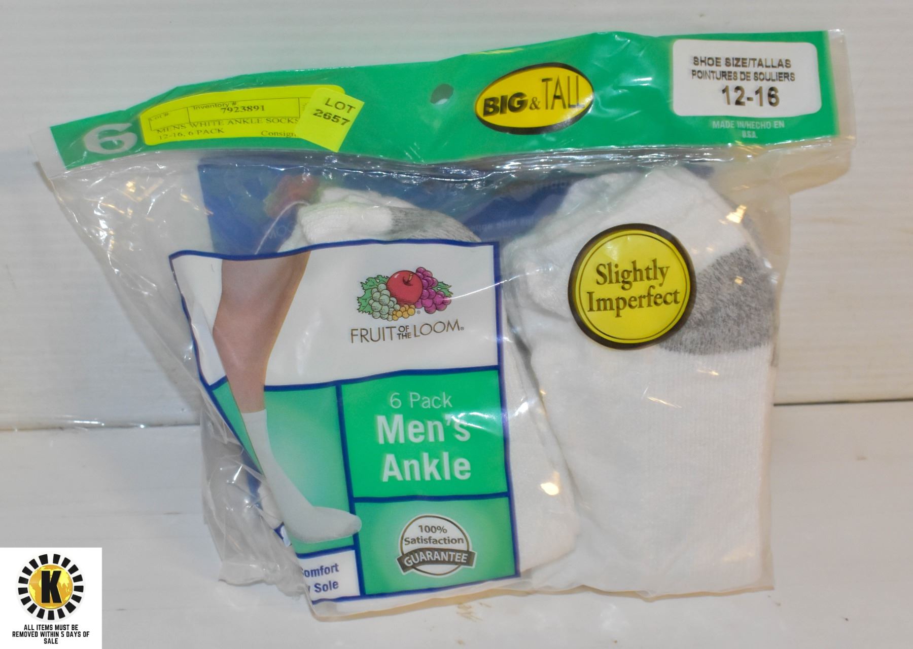 MENS WHITE ANKLE SOCKS, SIZE 12-16, 6 PACK