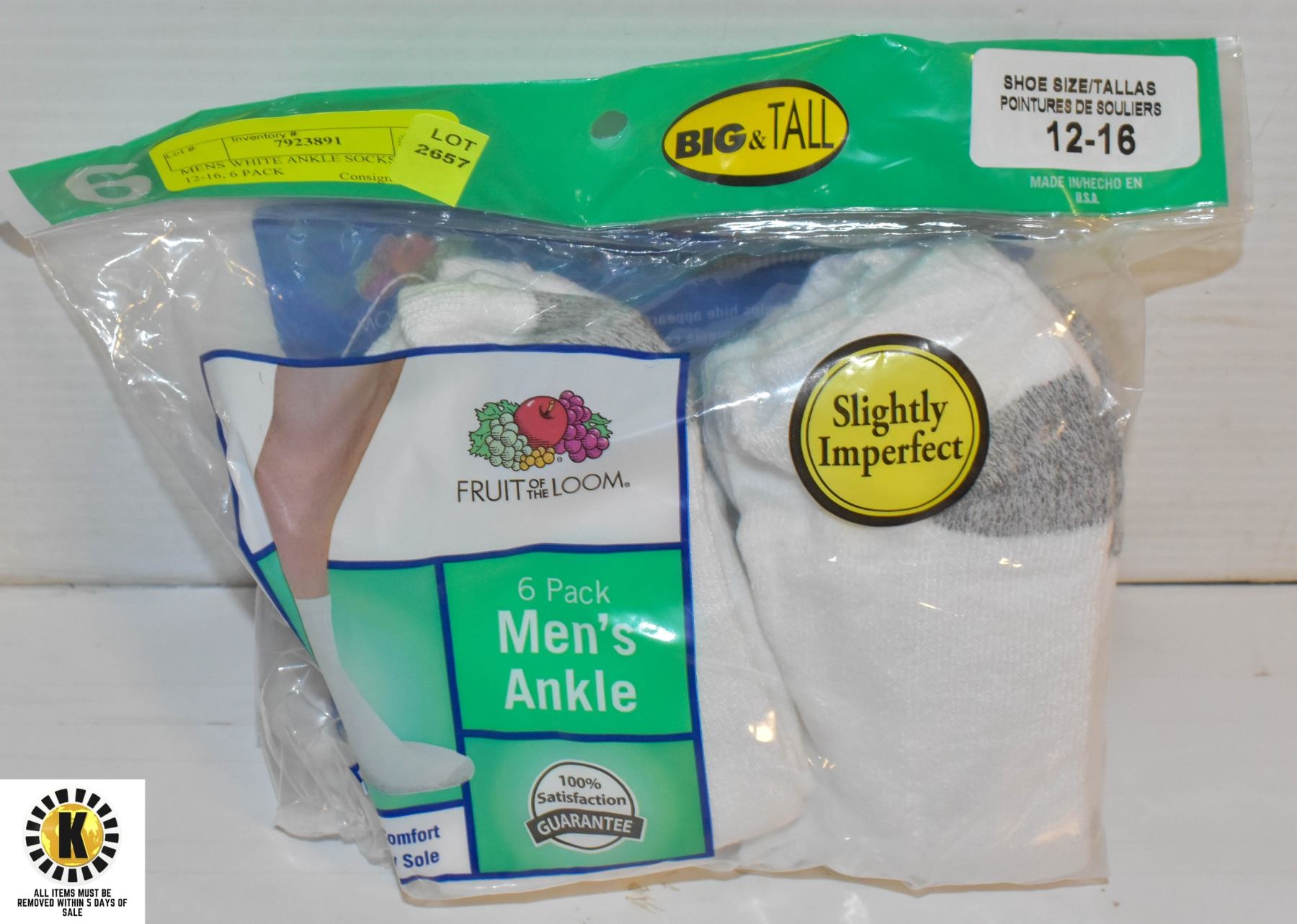 MENS WHITE ANKLE SOCKS, SIZE 12-16, 6 PACK