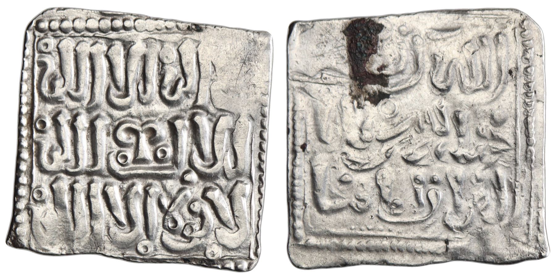 MERINID: Abu Al-Hasan 'Ali (1331-1351), silver square dirham (0.84g), AH 731-752. Legends identical to Almohad square dirhams, except the phrase "al-mahdiyyu imamuna" ("Al-Mahdi is our Imam") was replaced with "al-qur'anu imamuna" ("the Quran is our Imam"). Stylistic pattern, a tentative attribution to the Merinids based on the reverse "al-qur'anu imamuna" legend. - (possibly unpublished variety). Fine to very fine. Extremely rare or likely unique.