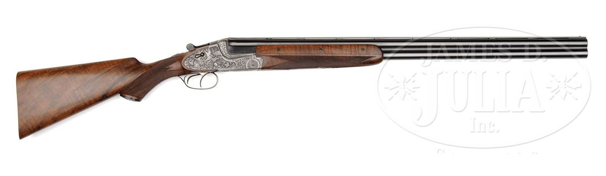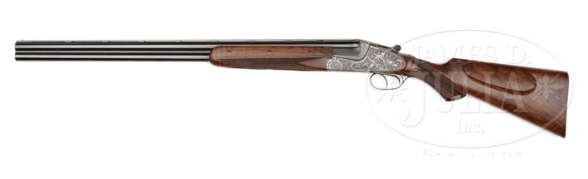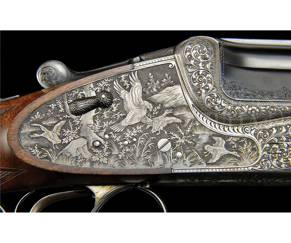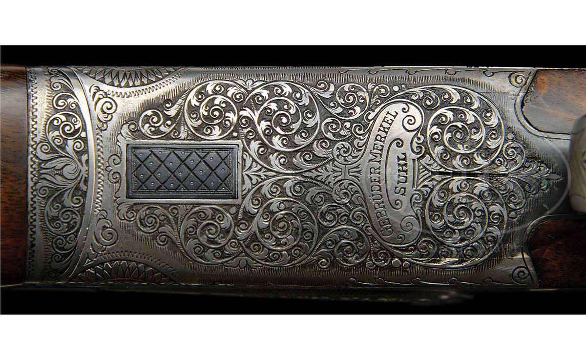 PLEASE NOTE (09-23-13) Gun is a 203E, not a 303E. It has a double underlug, not a double underbite as a 303E has. The engraving quality is, however, the type you might find on a 303. SN 47189. Cal. 12 ga. 2-3/4" Chambers. This fine, top of the line, Suhl made gun has 28" demi-bloc bbls mounted with nicely matted ventilated rib, marked "Gebruder Merkel" and "Suhl" on left ejector boss. Bottom bbl is stamped with East German nitro proofs, with a proof date of February 1958, along with steel information and SN. Coin finished OU action features automatic safety, double Kersten locking bolt, raised rib tumbler end cocking indicators, reinforcing bolsters, H & H style lock detaching pin, and double triggers (front articulated). Action is engraved with well cut, attenuated, large, shaded scroll with some floral highlights. Bottom is marked "Gebruder Merkel Suhl". Sidelocks are decorated with nicely detailed scenes of birds and dog; a trio of ducks erupt from woodland marsh (one hapless member being stooped upon by large hawk or eagle) on right lockplate; with trio of flushing woodcock being pointed by setter in open scrub land on left. Steel trigger guard is scroll engraved to match action. Well figured, and lightly streaked, dense European walnut long capped pistol grip buttstock measures 14-1/4" over checkered wood butt, and features dainty shadow line right hand cheekpiece, sunburst horn grip cap, and point pattern checkering at grip with broad flat mullered borders. Matching three piece ejector forend has Deeley type release. Bore diameter: top -.729, bottom -.727. Bore restrictions: top -.028 (Imod), bottom -.010 (IC). Wall thickness: top-.033, bottom -.030. Drop at heel: 2-5/8", drop at comb: 1-1/2". Weight: 7 lbs. 4 oz. LOP: 14-1/4". CONDITION: Excellent, retaining nearly all its orig finish on wood and metal, with only one or two faint marks in bbl blue. Coin finish slightly toned pleasingly, giving dramatic accent to engraving. Stock has a number of minor marks, one fairly heavy on left side near toe. Checkering darkened, but with little wear. A very fine and unusual Merkel. 4-48315 MGM24
