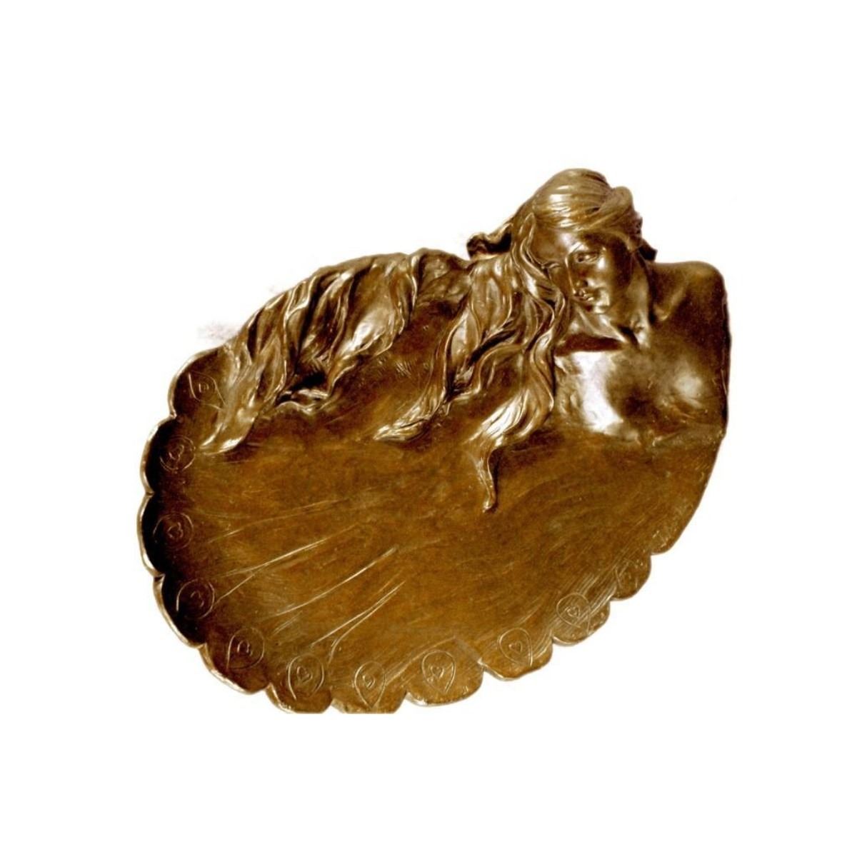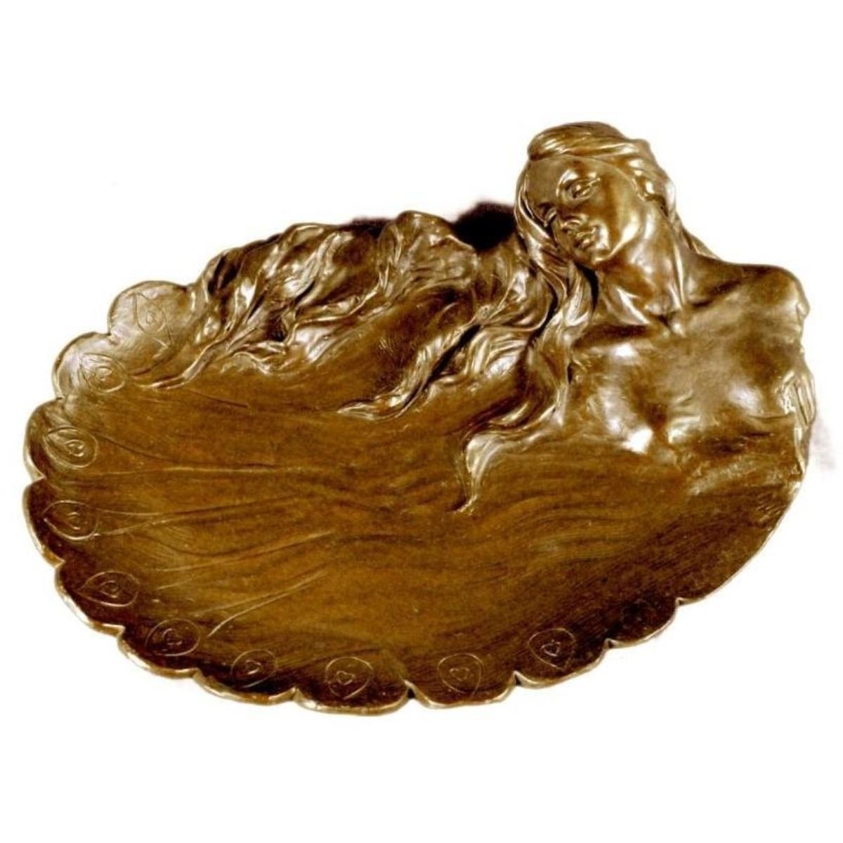 Art Nouveau style bronze dish or jewelry tray. Student of Joaquin Angles Cane, late 19th century. Beautiful girl with a peacock feather drape. Lost wax casting bronze. 3" X 11". 6lbs.