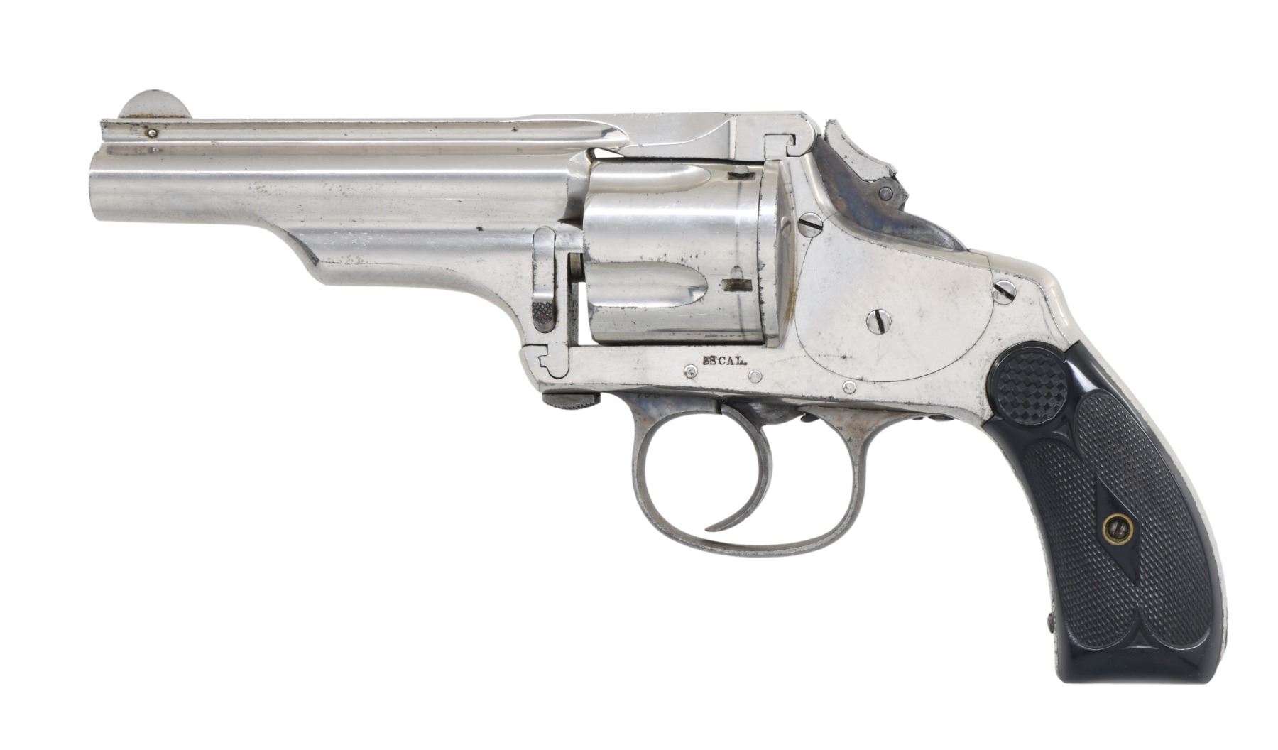 REVOLVER. Cal. 38 Merwin & Hulbert. S# 9304. Mfg. 1880's. Matching numbered 3.5" barrel with pinned blade front sight, Merwin & Hulbert address markings on rib & trench rear sight. Matching numbered 5 shot fluted cyl. Nickel finished with folding hammer spur & 2 piece hard rubber grips. CONDITION: good nickel with light marks & peeling finish in grip areas. Good grips. Very good bore. Appears to mechanically function when cycled by hand. (01-26455/MD). ANTIQUE. $700-1,000.