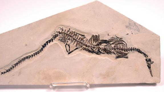 MESOSAURUS MARINE REPTILE. Mesosaurus was a very important 260 million year old marine reptile that was the first known reptile to return to the sea shortly after evolving from amphibians but even more importantly helped to prove the theory of continental drift as it is found only on the western part of South Africa and the eastern part of South America. This huge nearly complete 25 inch long fossil on a 23 x 9 inch limestone matrix is from the Irati Formation of Brazil. The attractive brown bone has excellent 3D detail of the vertebrae, rib bones, delicate neural spines and the crocodile-like skull that is preserved in a side view with several small sharp teeth visible in the clenched jaw. This considerably above average specimen is missing three of the legs and a few bones at the tip of the tail. This fossil Mesosaurus has both size and exceptional bone quality with the average Mesosaurus being only 12-16 inches long .
