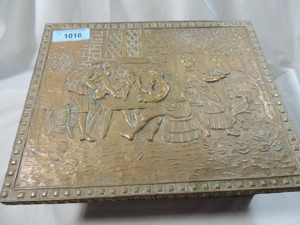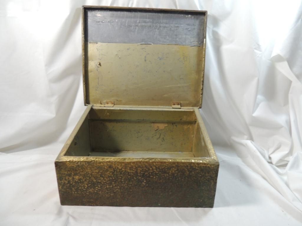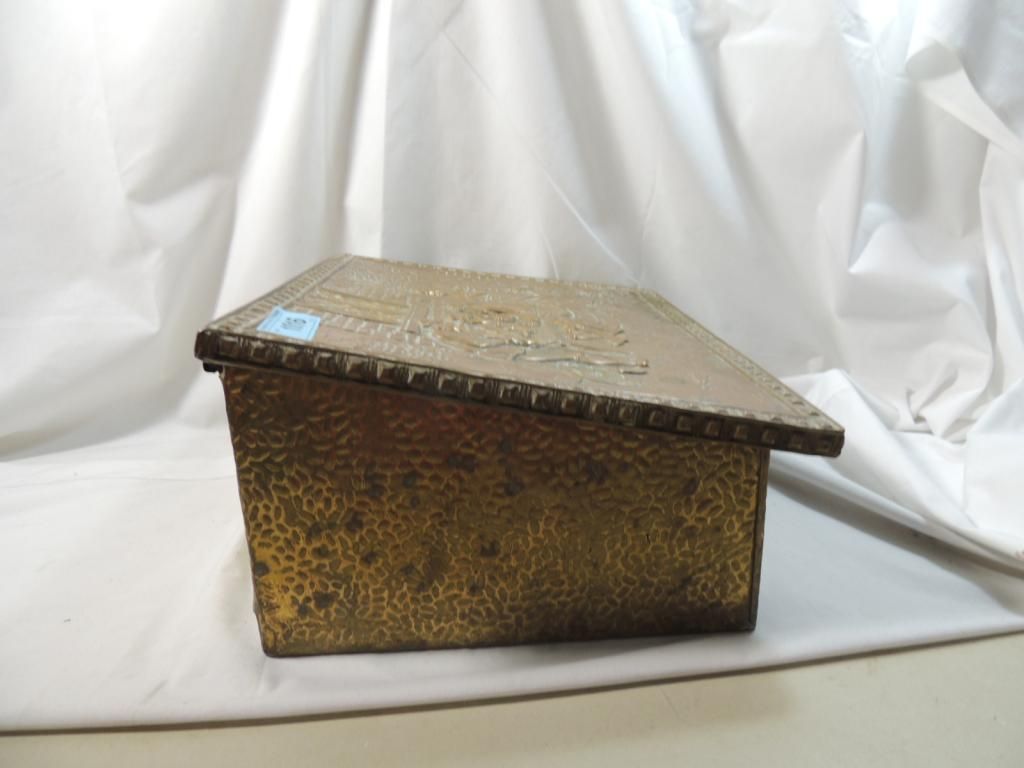 METAL AND COPPER LIDDED BOX EMBOSSED VINTAGE DESIGN GOOD FOR STORAGE. AS SHOWN. SEE PHOTO FOR MORE DETAILS