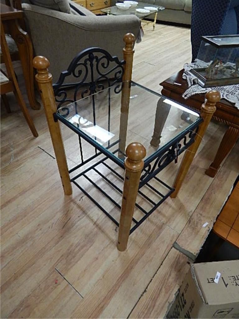 METAL AND WOOD END TABLE WITH GLASS TOP - NEW