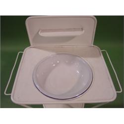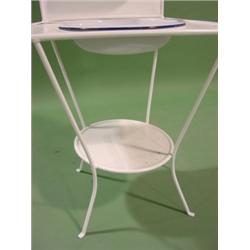 METAL DOCTOR'S WASHSTAND WITH BOWL. Has been overpainted with white paint. Towel bars on sides and soap rack on splash back. 38" H to top of splashback, 27" W, 20" D