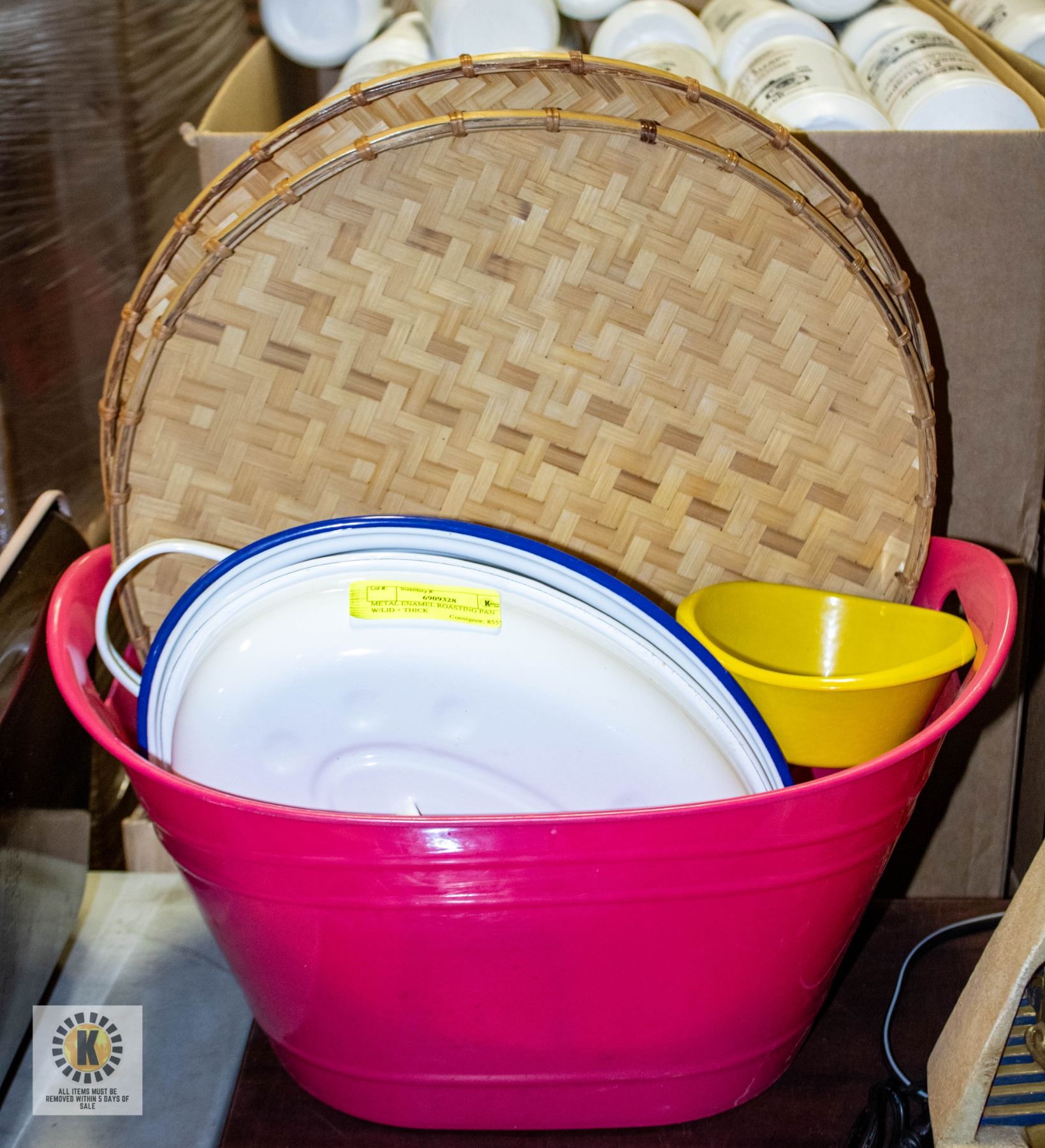 1/2 INCH THICK METAL ENAMEL YELLOW BOWL + 2 WICKER TRAYS 14 INCH DIAMETERS **ALL ITEMS MUST BE REMOVED BY 5PM SATURDAY, APRIL 26TH 2025. ALL REMAINING ITEMS WILL BE SUBJECT TO A $6.00 PER DAY STORAGE CHARGE. ANY ITEMS REMAINING AFTER MONDAY, MAY 12TH 2025 WILL BE CONSIDERED FORFEITED. NO REFUNDS WILL BE ISSUED FOR FORFEITED ITEMS. TO SCHEDULE A PICK UP APPOINTMENT CLICK HERE