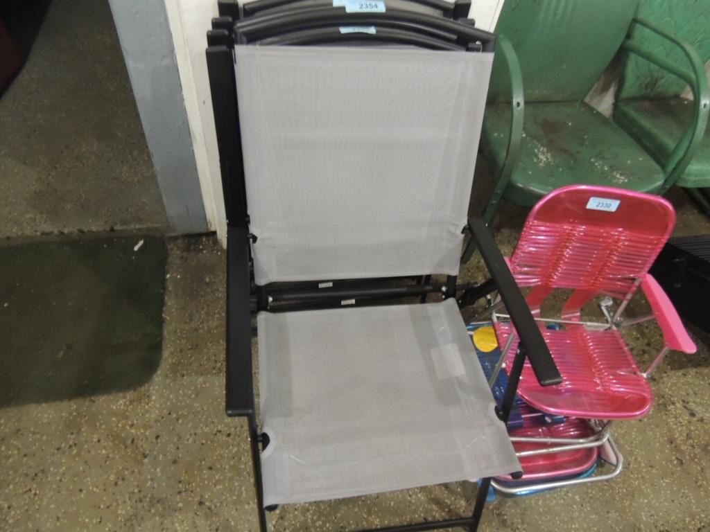 NYLON AND METAL FRAME FOLDING CHAIR, PATIO CHAIR, EXTRA CHAIR, GOOD CONDITION, NEW CHAIR, FOLDING CHAIR, AS SHOWN SEE PHOTO FOR MORE DETAILS.