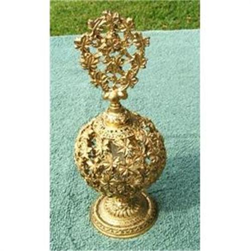 This is a beautiful filigree perfume bottle. It has a glass vial inside where the perfume goes and a long glass dabber. I believe this is a Guildcrest perfume from the 1940-50s era. They advertised their bottles to be 24KT Gold plated, Non-Tarishable. I had one a while back similar to this and it had a Guildcrest paper label on it. This one doesn't but that is why I think it might be a Guildcrest. It is in excellent condition and is about 8 1/2" tall and the base is almost 3" round.
