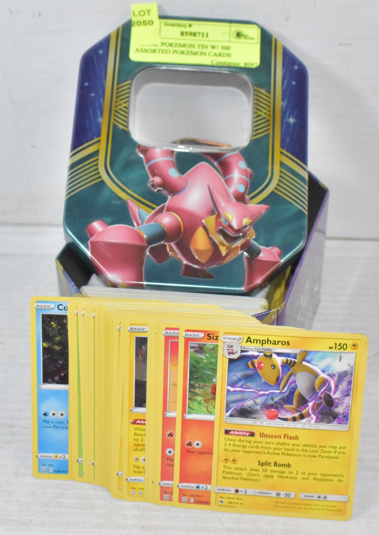 METAL POKEMON TIN W/ 300 ASSORTED POKEMON CARDS