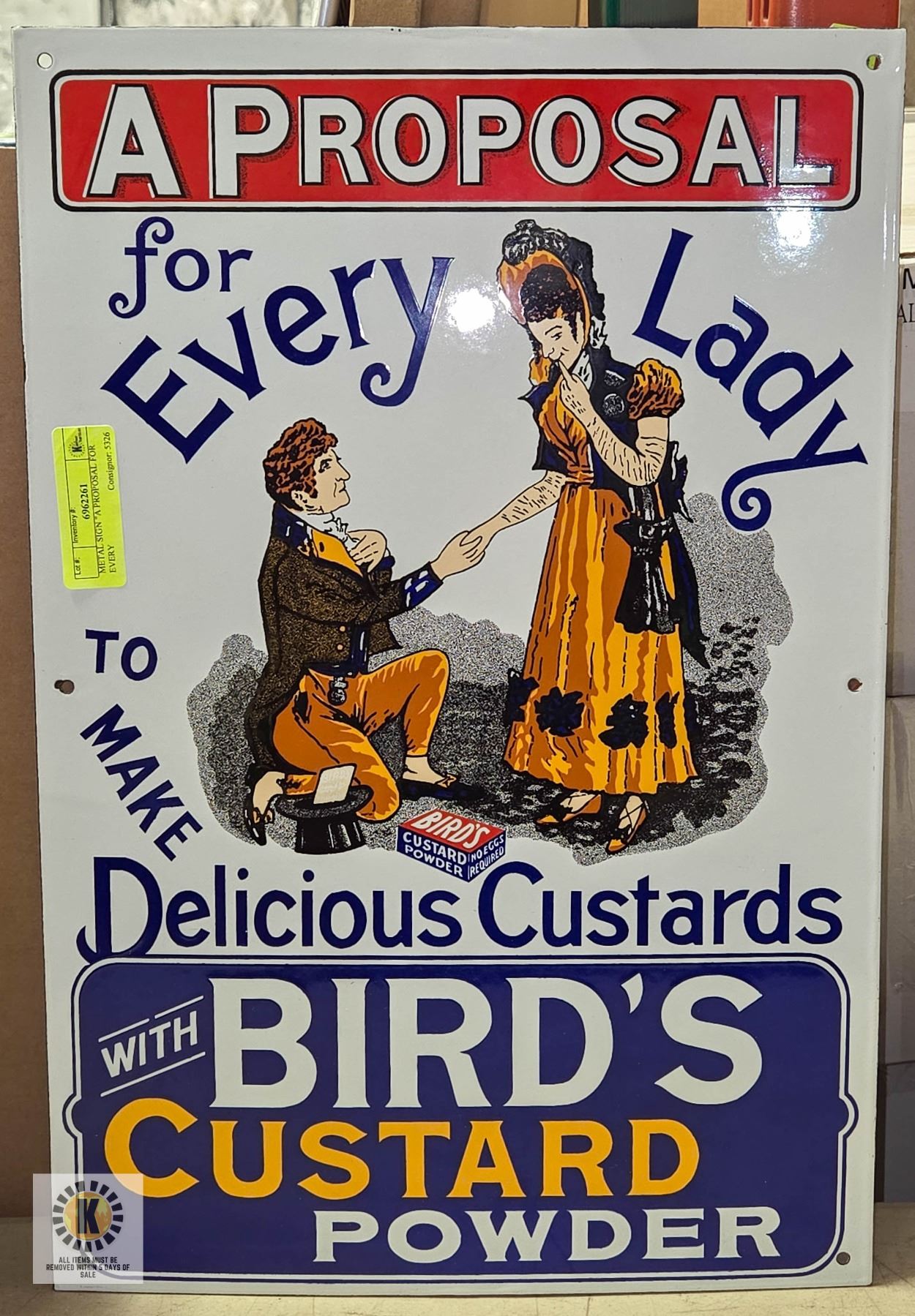 FOR EVERY LADY TO MAKE DELICIOUS CUSTARDS WITH BIRD'S CUSTARD POWER" 14" X 20.5" APPROX. **ALL ITEMS MUST BE REMOVED BY 5PM SATURDAY, APRIL 3RD 2025. ALL REMAINING ITEMS WILL BE SUBJECT TO A $6.00 PER DAY STORAGE CHARGE. ANY ITEMS REMAINING AFTER MONDAY, MAY 19TH 2025 WILL BE CONSIDERED FORFEITED. NO REFUNDS WILL BE ISSUED FOR FORFEITED ITEMS. TO SCHEDULE A PICK UP APPOINTMENT CLICK HERE