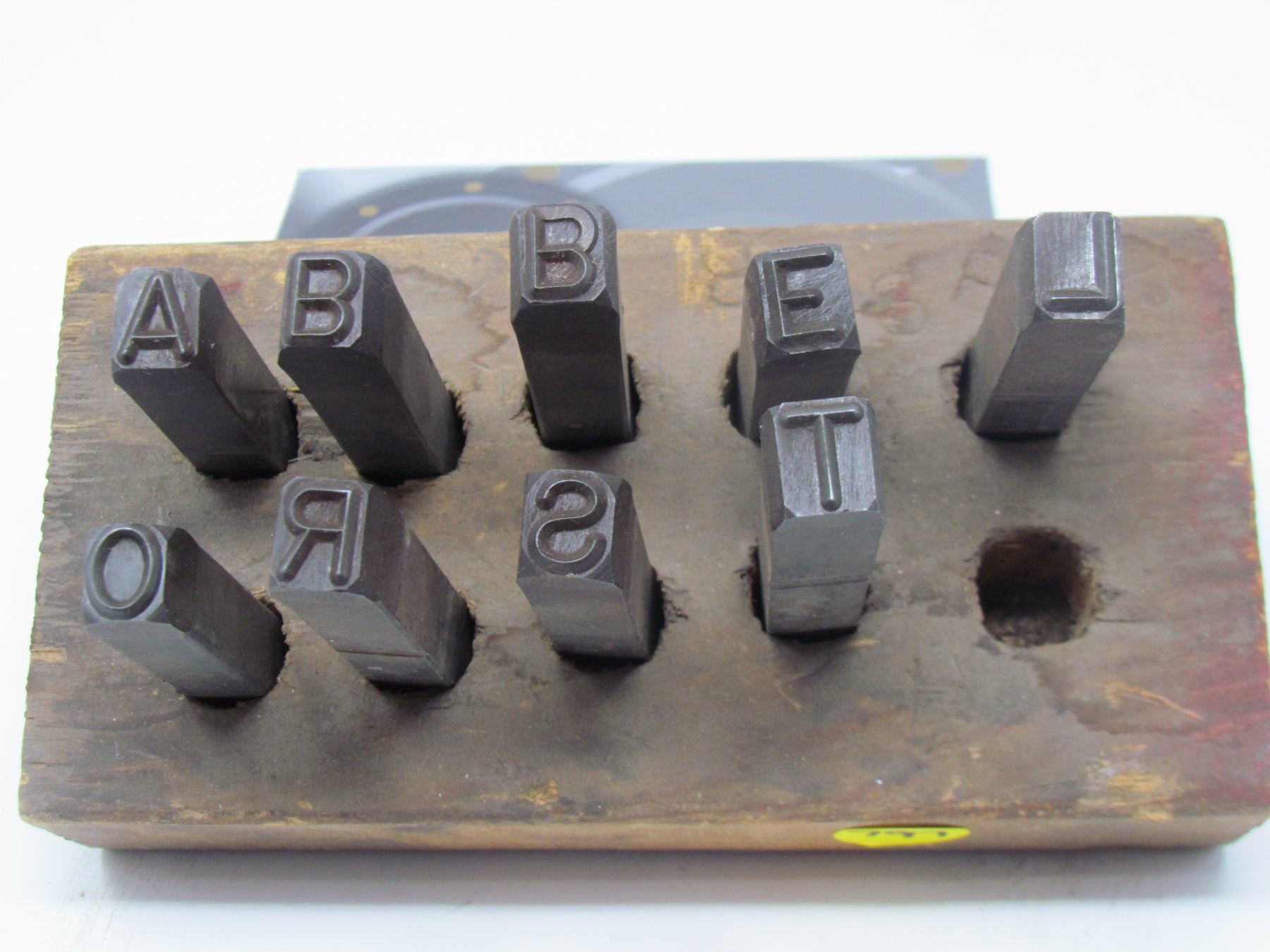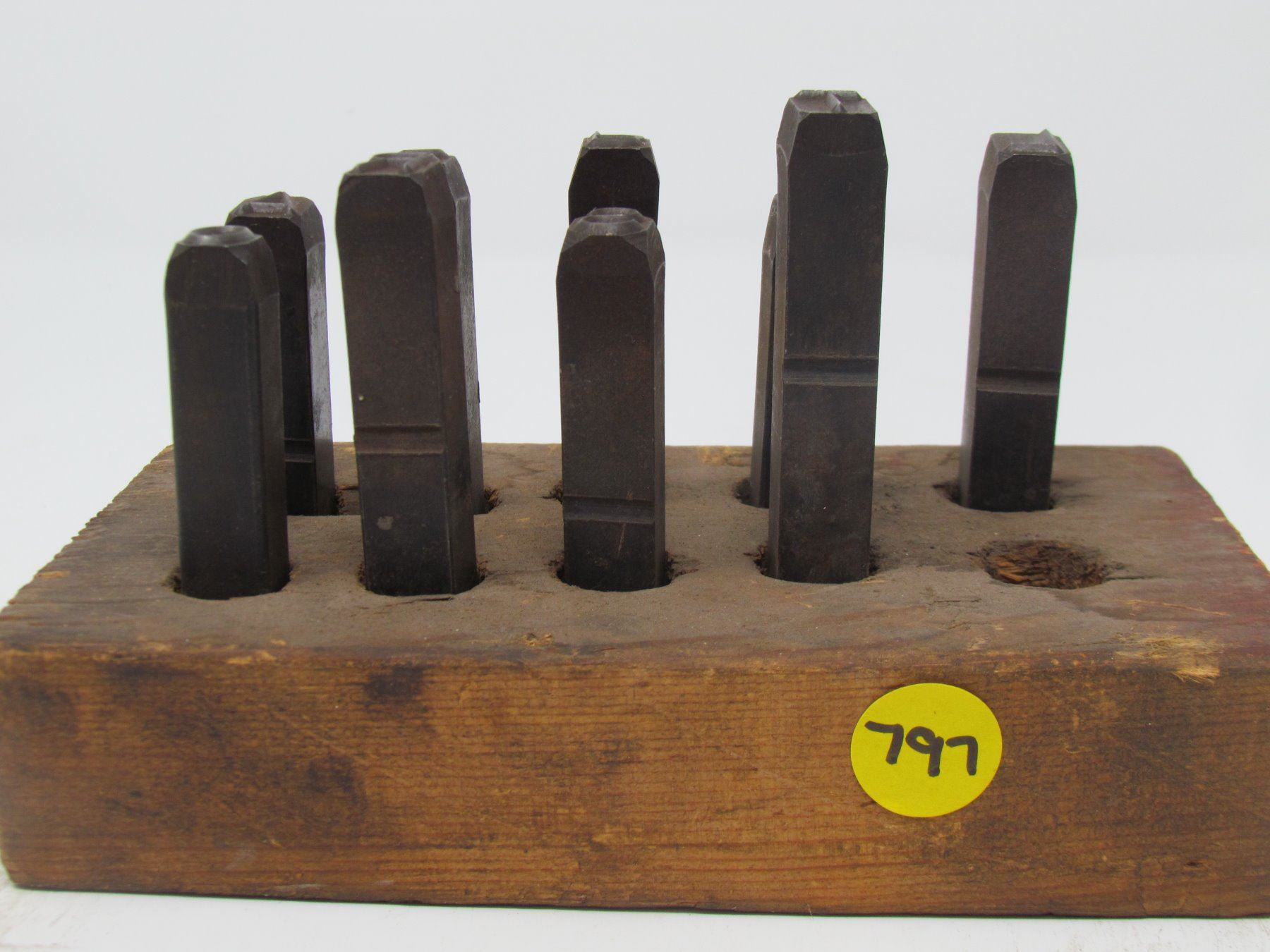 METAL STAMPS, (QTY 9) W/WOOD STAND 1/2 SQ.