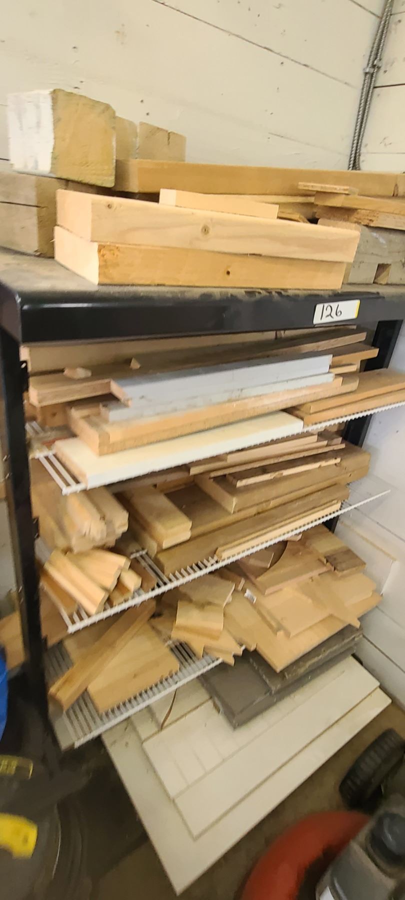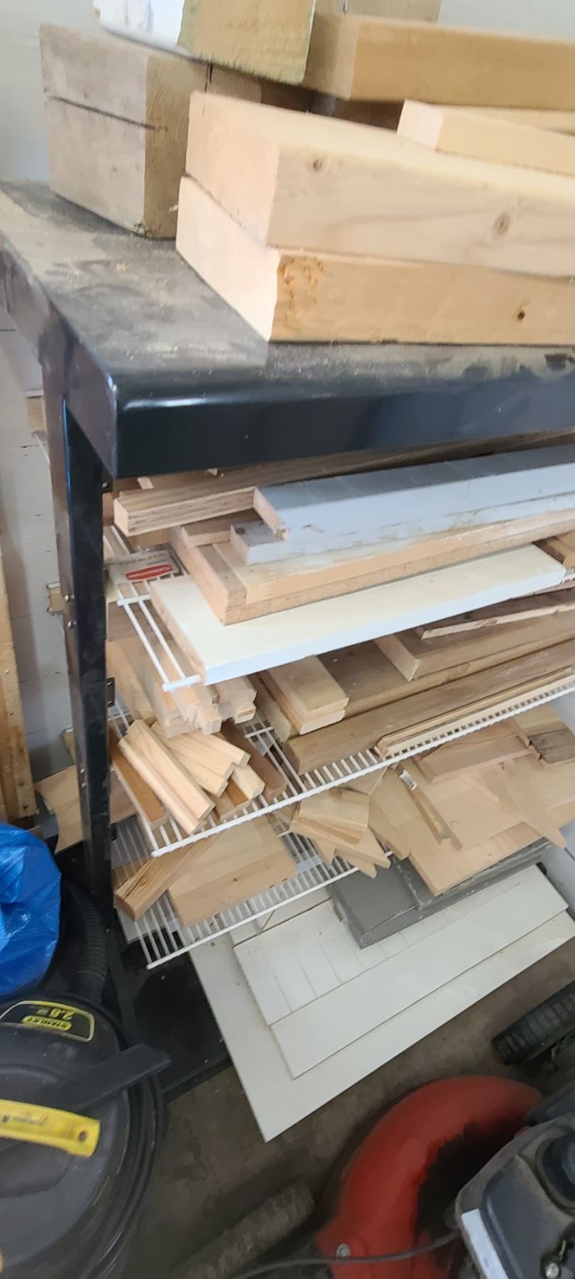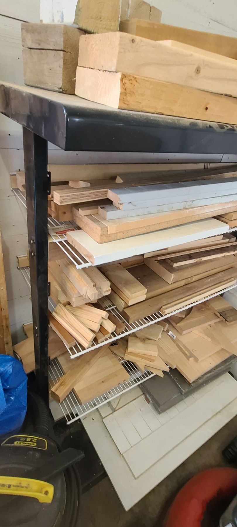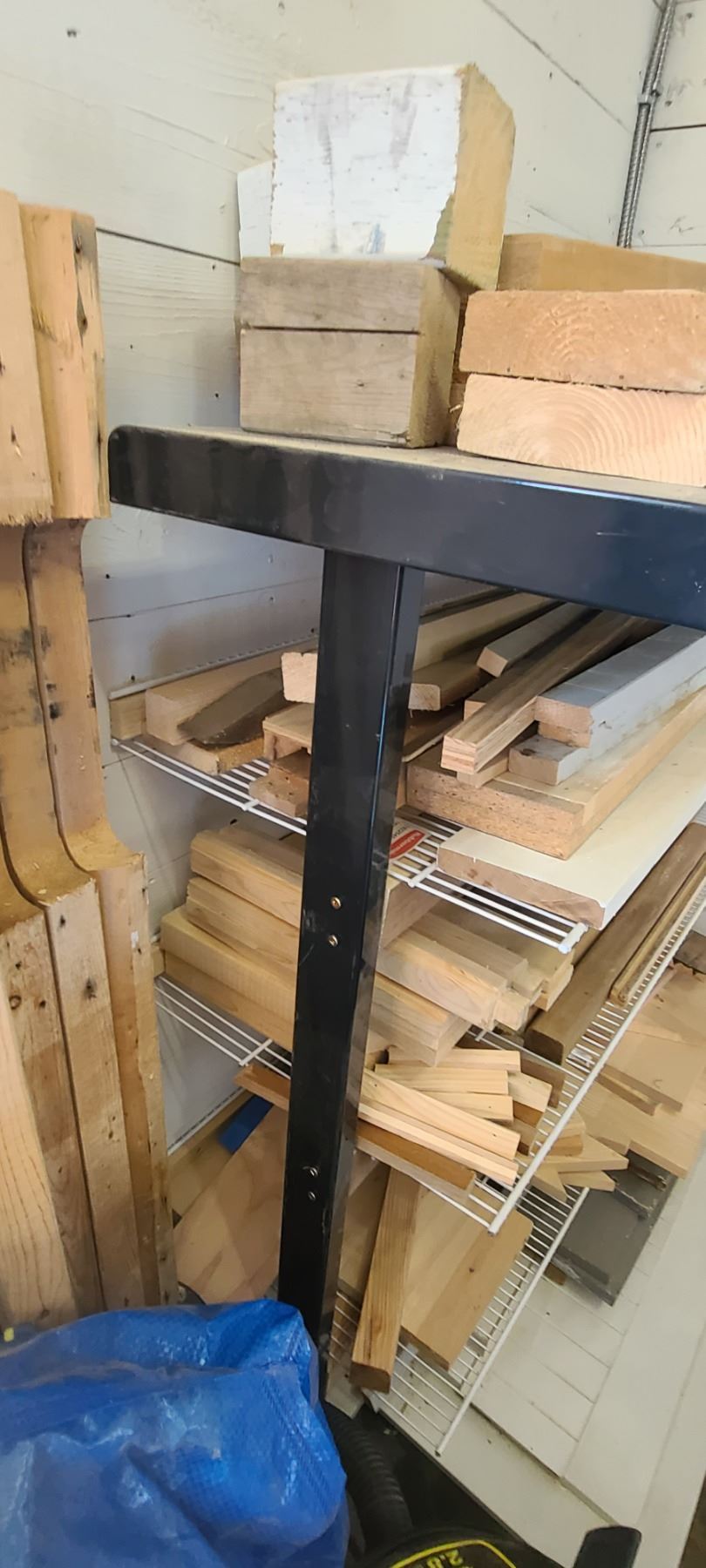 METAL STAND COMES WITH THREE SHELVES AND SCRAP WOOD