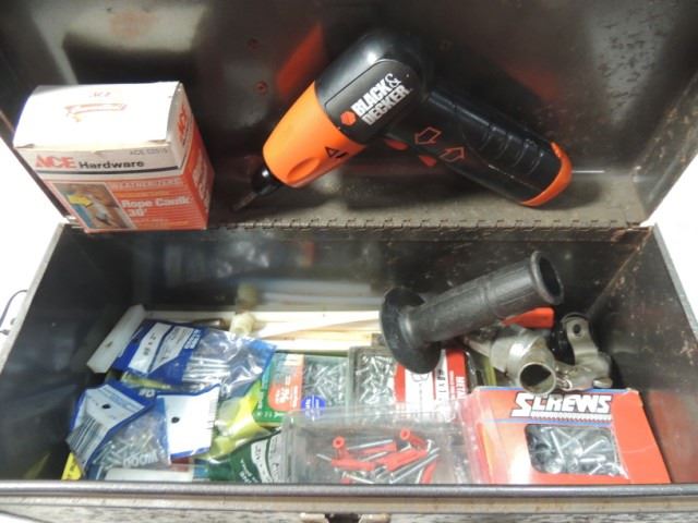TUBE CUTTING PARTS, WRENCHES, SCREWS, FASTENERS, BLACK AND DECKER SCREW GUN, AND MORE, AS SHOWN.