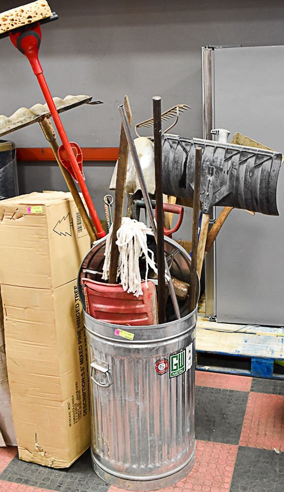 METAL TRASH CAN WITH YARD TOOLS & DROP BARS ETC
