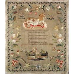 METALWORK, BOXES AND OBJECTS - A Victorian silk needlework sampler, finely embroidered with a continental landscape and lap dog within ribbon tied floral borders and verse, signed and dated 1844, 19in x 16.5in (see illustration)