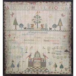 METALWORK, BOXES AND OBJECTS - A George III needlework sampler, embroidered with verse, buildings, birds, animals and trees, signed and dated Oundle, 1800, 13.75in x 13in, framed (faults)