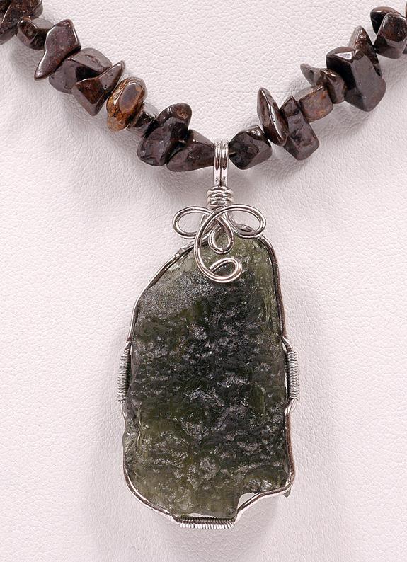 METEORITE JEWELRY STONY METEORITE AND MOLDAVITE. This lot offers a very rare opportunity to purchase jewelry that was handmade out of genuine stony meteorites and custom designed to represent the ultimate in fine jewelry. To be able to cut up meteorites to make jewelry is a rare luxury due to the rarity and high value of nearly all meteorites. Fortunately enough meteorites were found in 1999 in Algeria of one large fall (almost 1500 Kg) to allow a small portion to be made available to be used in jewelry. There will not be any more cut into jewelry since as much as 80% of the meteorite is lost in the cutting. The stony meteorite has been assigned the name of North West Africa 869 and has been classified as a L4 or L5 breccia. All stony meteorites contain iron and all designated with a H for high iron content or L for low iron content and breccia means that the meteorite is a mixture of several different types of rocks that were mixed together when the two asteroids that created this meteorite collided billions of years ago.