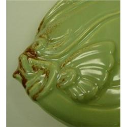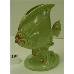 Metlox by Carl Romanelli. Fish vase. Light green glaze with brown highlights. 8.5" tall. Condition: Excellent