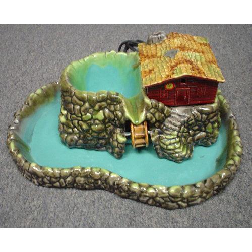 The Old Mill ensemble by Metlox Potteries is one of the Nostalgia line made between 1946 and 1960. It is made up of 4 pieces. The roof of the mill houses the pump. It was mostly used for window displays in department stores and very few were made. This one has a few tiny chips as seen in the pictures, but it works very well and they don't distract. Metlox made only 2 items that had these working pumps to circulate water of which this is one.