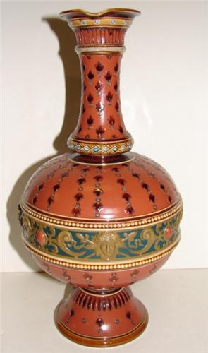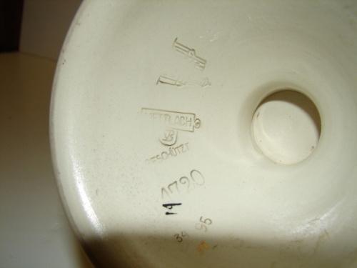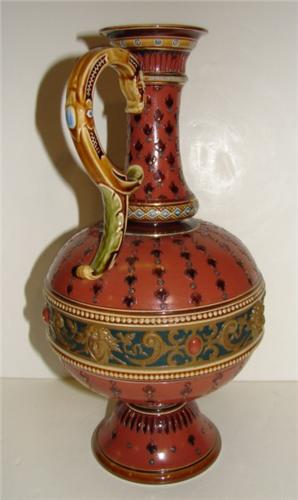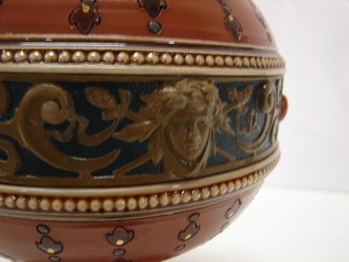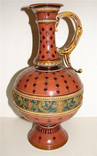 METTLACH STONEWARE EWER. Mask decoration. Marked on bottom “Mettlach/Geschutzt/1720”. 12.25” H