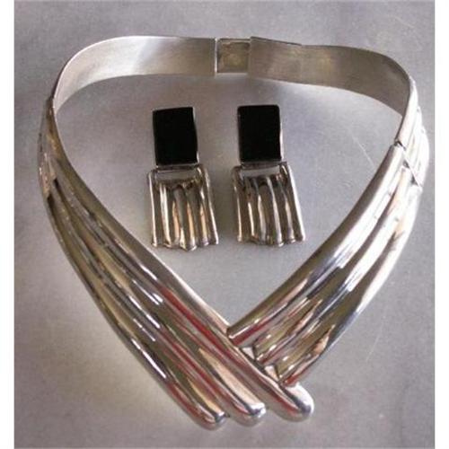 FOR THE GAL THAT LOVES TO BE CENTER STAGE!<p>Combination of drama and grace, this Mexican Silver will catch the crowd's eye.  Clamp style, sterling silver necklace with an interlocking clasp with dramatic onyx and silver dangle earrings that are drop dead gorgeous. (Size: 2" length x 3/4" wide). Pierced  <p>Necklace Hallmark: ME-15, Plata-Mex.S.A., Hecho En Mexico, .925 Sterling.<p>Measurement:  4" DIAMETER, 5" FROM BACK CLASP TO FRONT, 1 1/4" WIDTH OF NECKLACE AT WIDEST POINT.