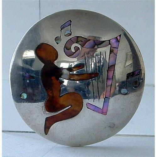 FINE MEXICAN STERLING SILVER AND MOTHER OF PEARL MUSICAL BROOCH/PENDANT.