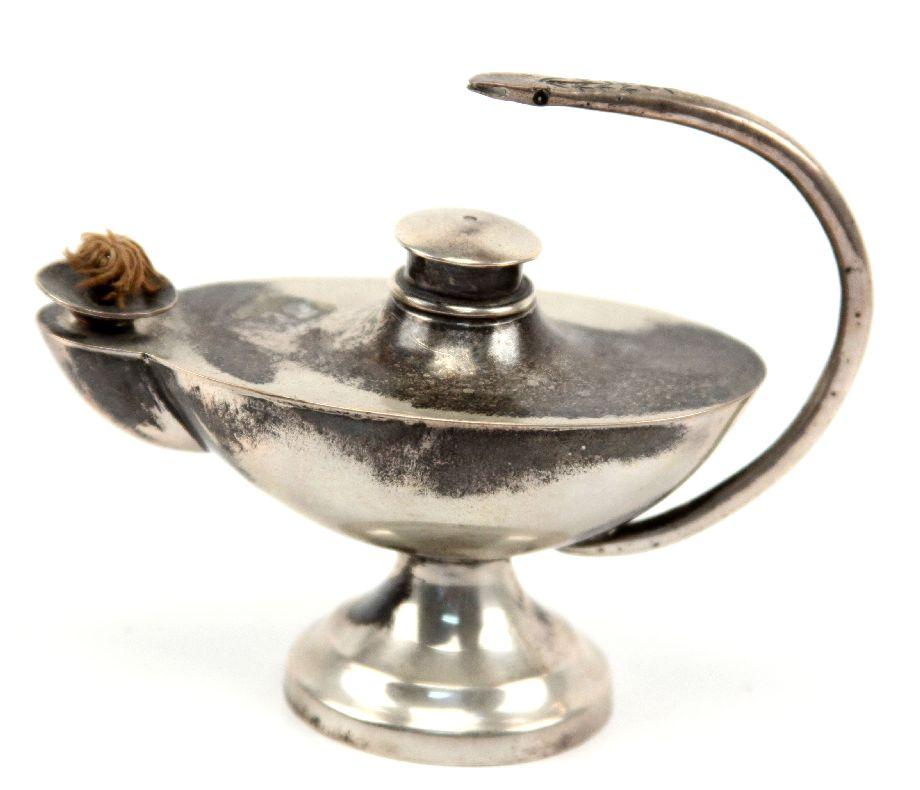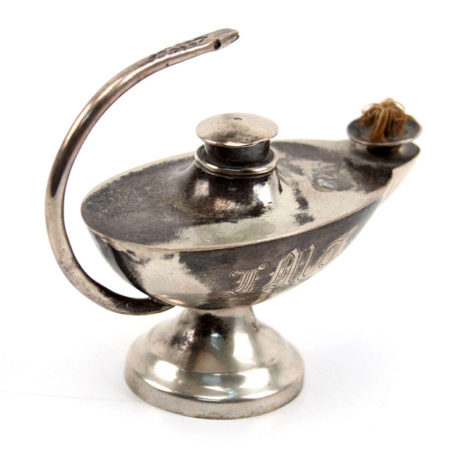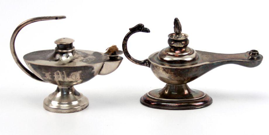 A pair of sterling silver oil lamps 1 marked Sanborns Mexico with a serpent handle standing 3.25 inches and is complete and appears to be un-weighted it is monogrammed, it weight is 2.75 OZT, the second marked Peruana Plata esterlina .925 has a bired head figural handle is not monogrammed it is missing the wick cap and with handle stands 3.25 inches and its total weight is 2.75 OZT.