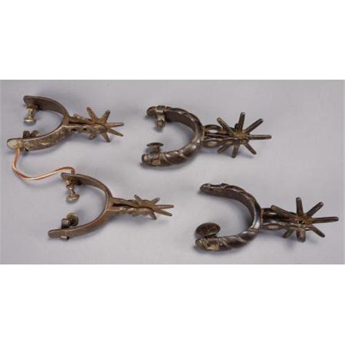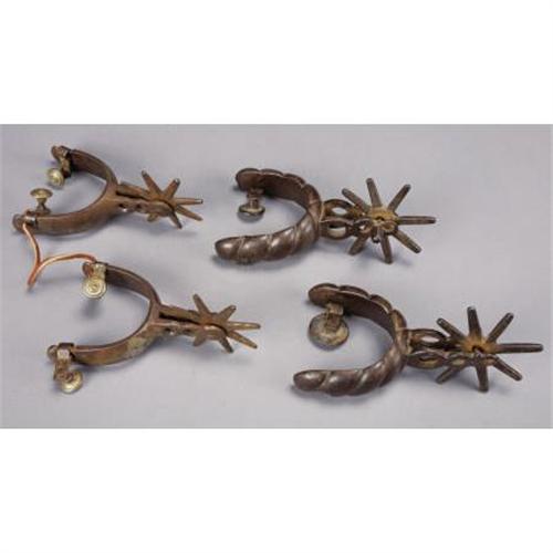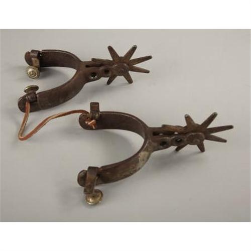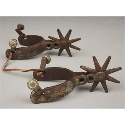 <B>MEXICAN PLATED SPURS CIRCA 1900</B></I> - Heavy roweled (3”) nickeled spurs with 1” rounded bands; 2¼” shanks and swinging buttons.<BR><BR><B>Condition</B></I>: Very good with 10% of plating remaining.<BR><BR><b>Shipping:</b> Miscellaneous Collectibles, Larg (<a target="_blank" href="http://www.heritageauctions.com/common/shipping.php">view shipping information</a>)