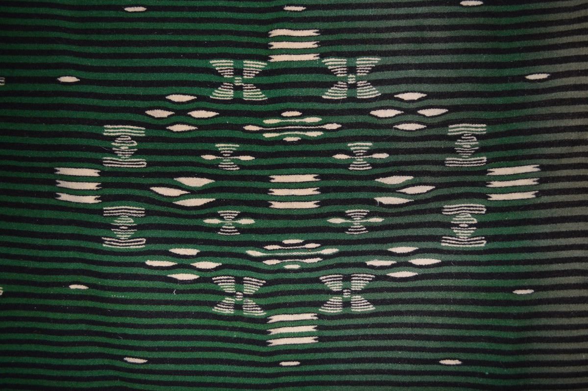 1910's. Banded green and black with white geometric bands, border and fringe. Has fade. 39" x 76"