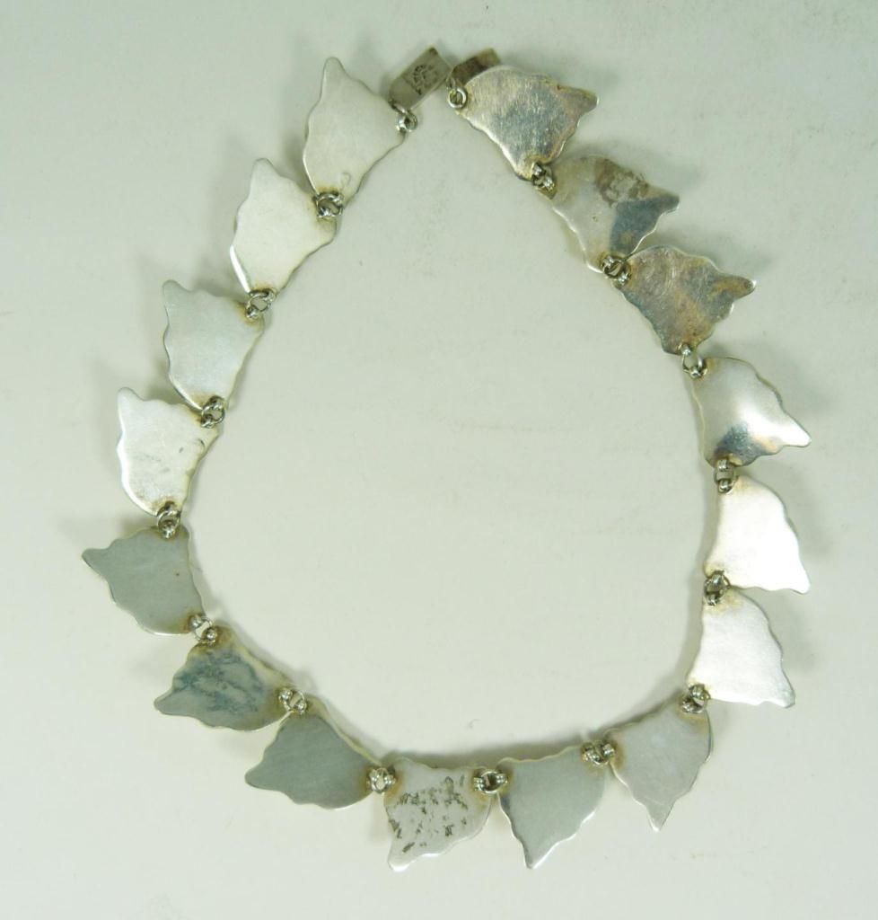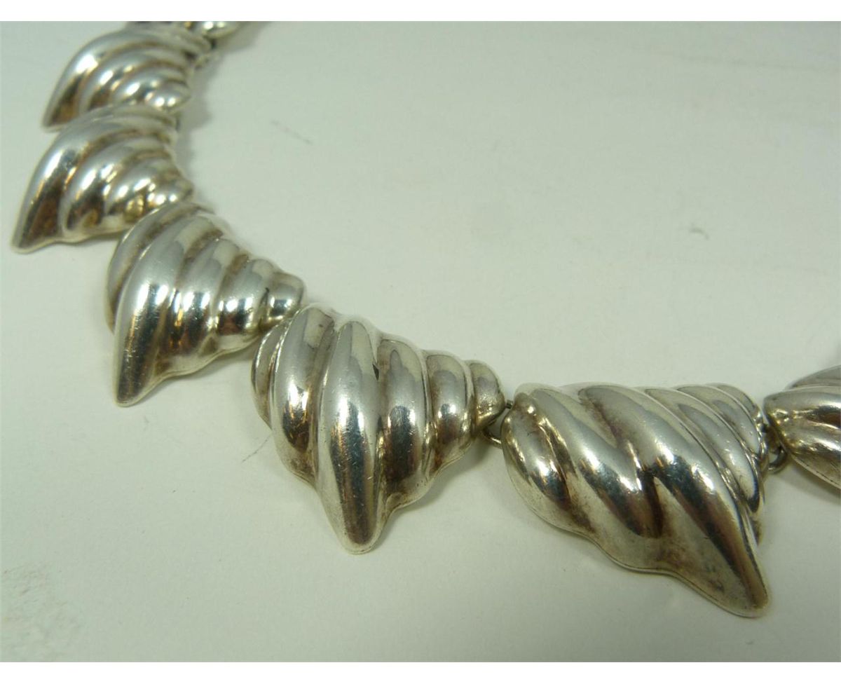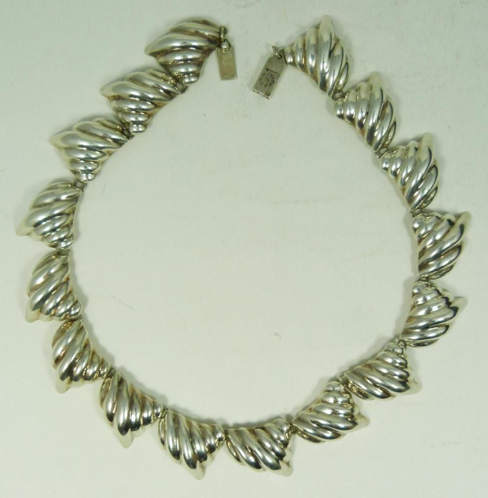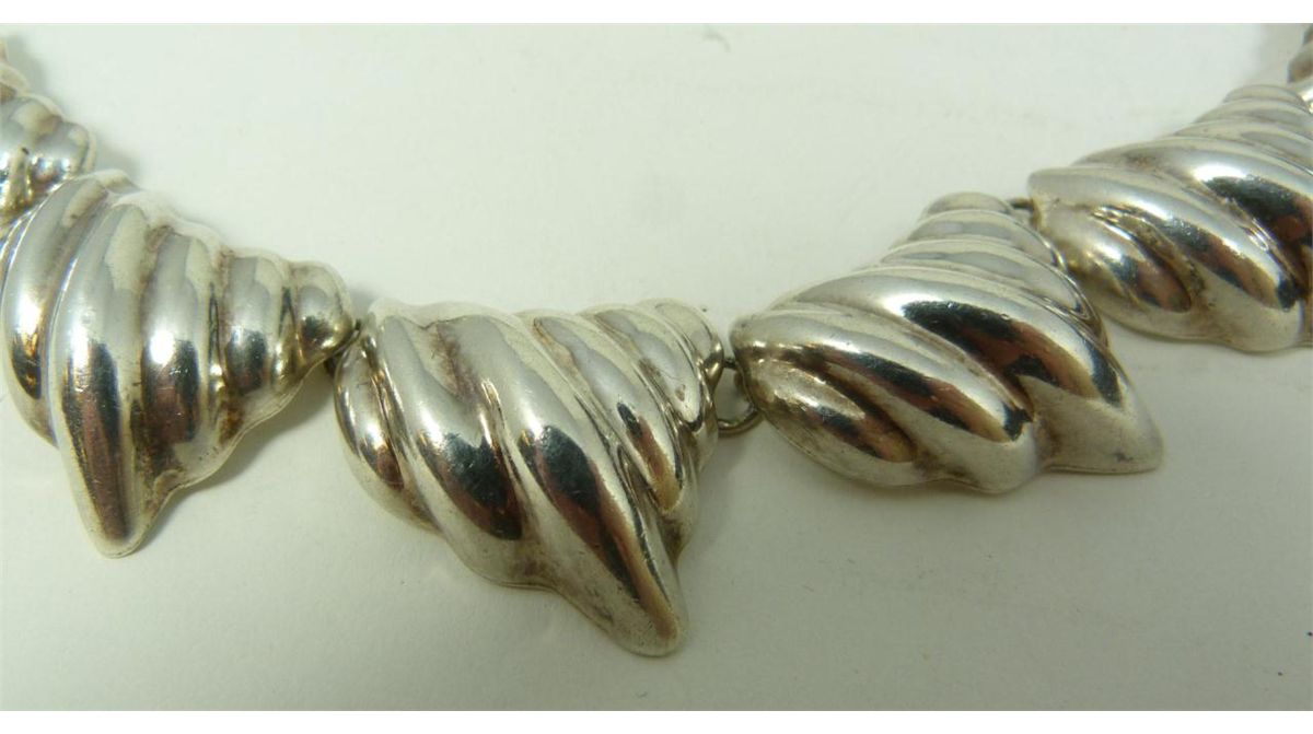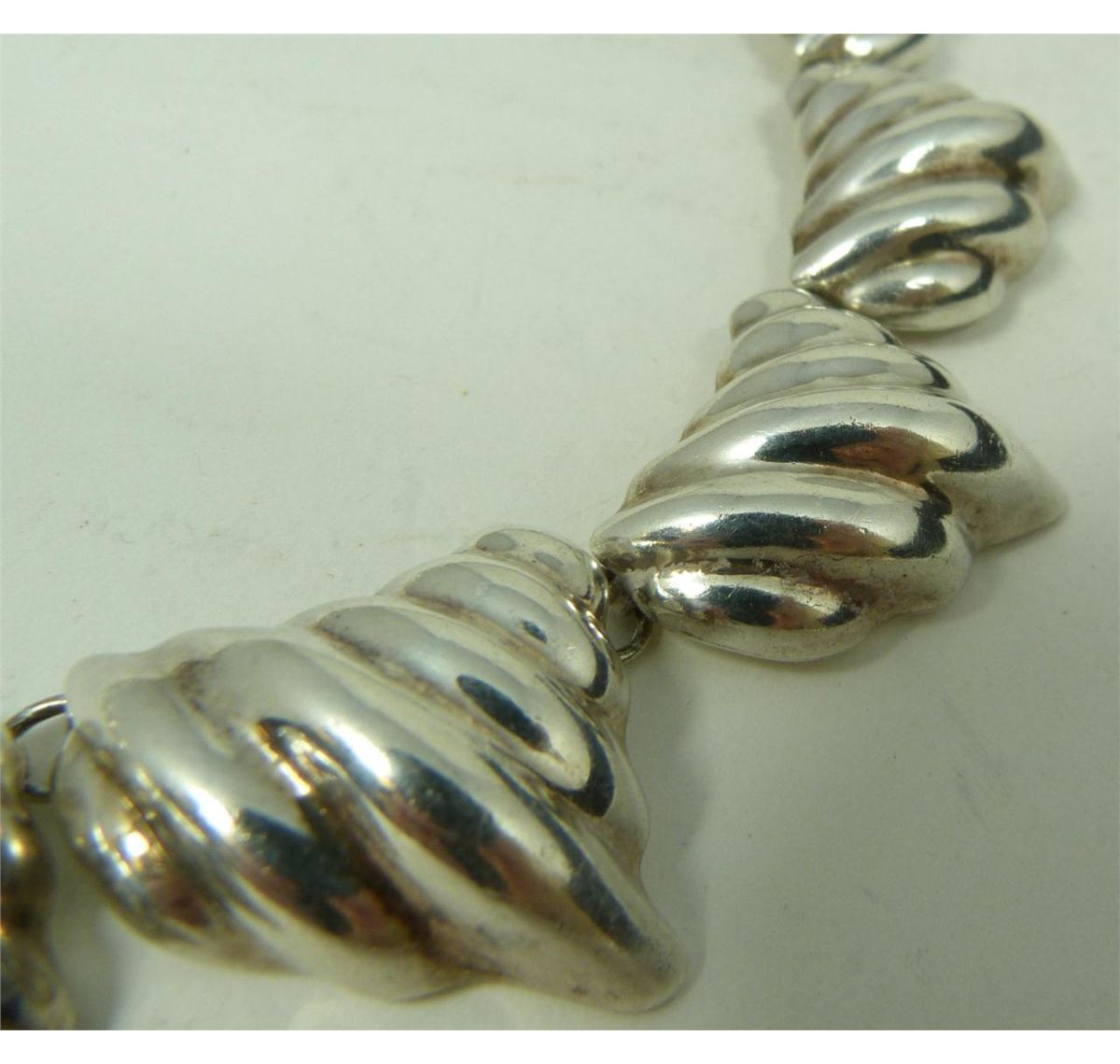 Mexican sterling silver necklace having a seashell design. Measures 18 1/2" length (46.9cm). Measures 25mm width. Total weight of 4.2ozt.
