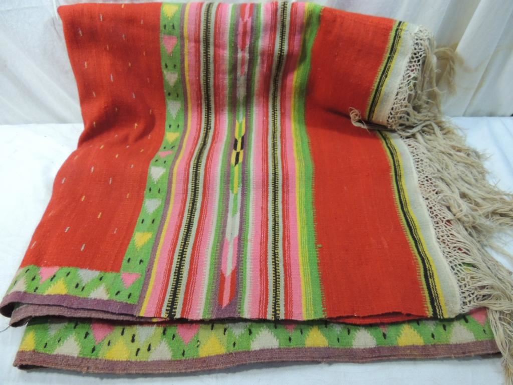 AREA RUG, MEXICAN RUG, RED RUG, COLORFUL RUG, PINK, RED, YELLOW, GREEN, AS SHOWN SEE PHOTO FOR MORE DETAILS.