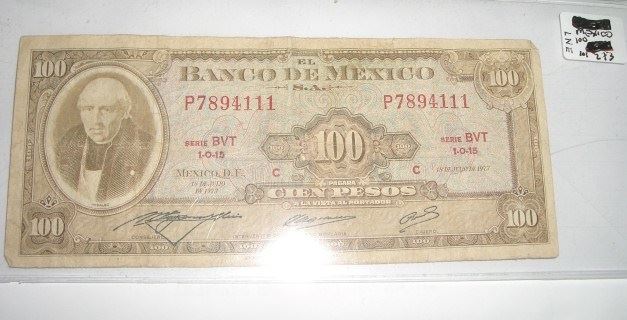 MEXICO 100 CIEN PESOS SERIAL # P7894111 BANK NOTE!! NOTE CAME OUT OF SAFE!! ***Coin, Currency & All Items Listed in this auction - Grades, Conditions and Values are not Safe Deposit Coins LLC Responsibilty. Grades, Condition and Values are determined by Consigner(s) & Buyers ONLY***