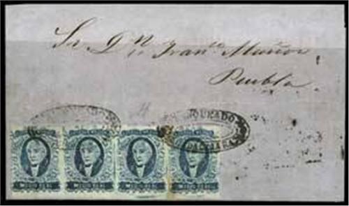 1861 Entire to Pueble franked with horiz strip of four ½r blue tied by two oval Guadalajara cancels, staining between one pair