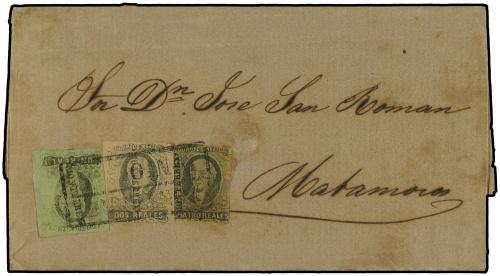 1863 Cover franked with 1 r. black on green, 2 r. black on pink, and 4 r. black on yellow imperforate Hidalgo issue (Sc. 7,8,9) with overprints, prepaying the 7 r. rate to Matamoros, and all tied by framed MONTEREY datestamp. A very fine and scarce three color franking from the famous San Roman correspondence.