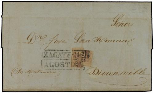 1858/89 Cover franked with two quadrasects of the 8r. lilac imperforate Hidalgo issue (Sc 5d) with overprints, prepaying the 4r. rate to Brownsville, Texas, and all tied by framed ZACATECAS datestamp. A very fine and rare franking, from the famous San Roman correspondence.