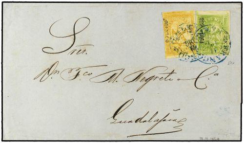 1864 (December) Cover to GUADALAJARA franked by Eagle issue 3rd period 2 r. yellow and 4 r. green (both invoice 229-1864, 3000 of 2 r. consigned and 800 of the 4 r.) tied by blue MEXICO CITY cds´s. A fine and scarce franking. Scott 23, 24.